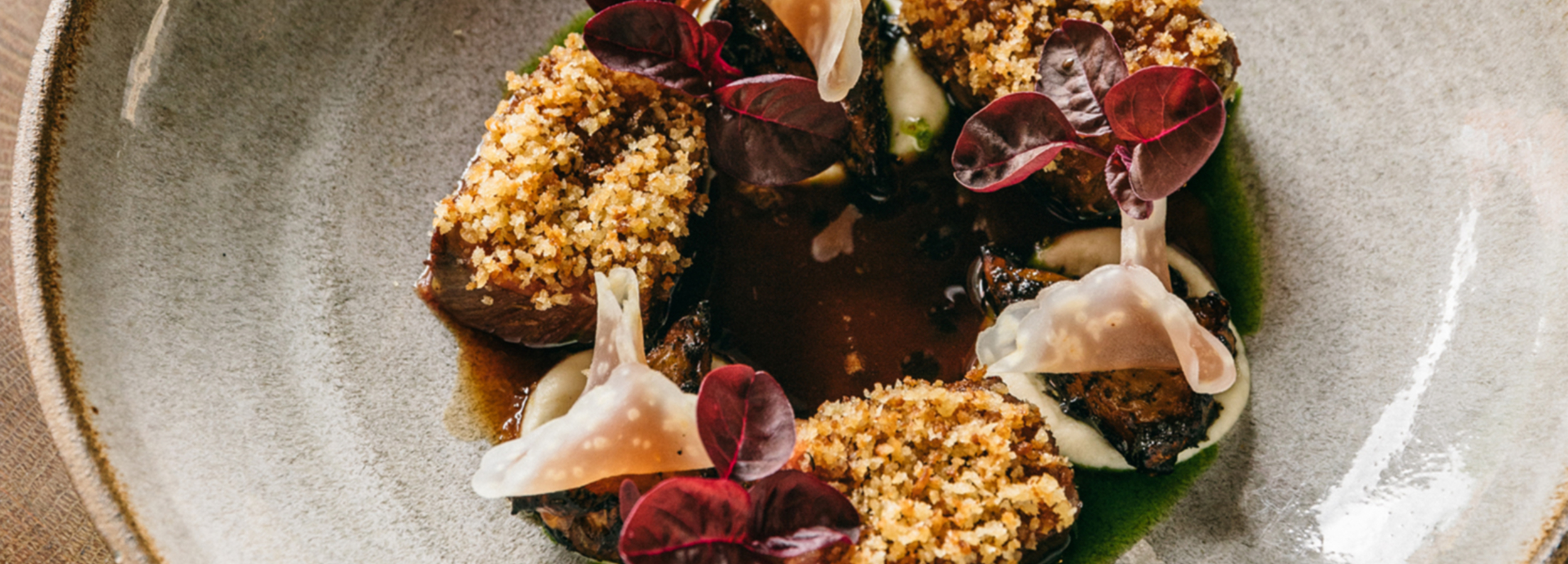 with stuffed morels, canola, golden beets, elderflower and lemon thyme jus.
