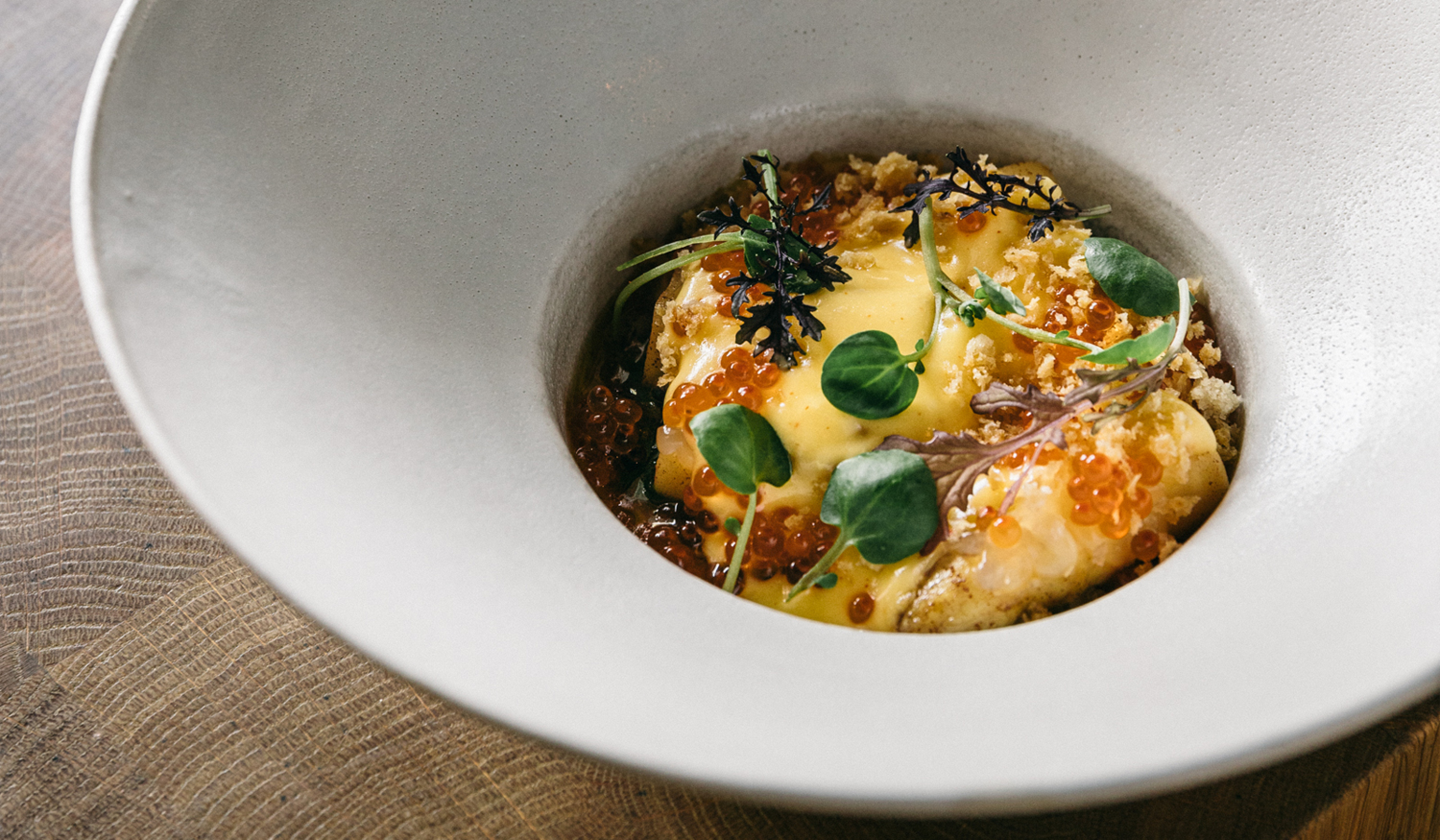 with vendace roe, oyster, horseradish, kohlrabi and Swedish seaweed.